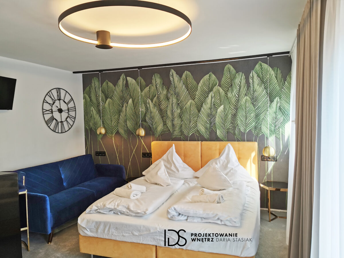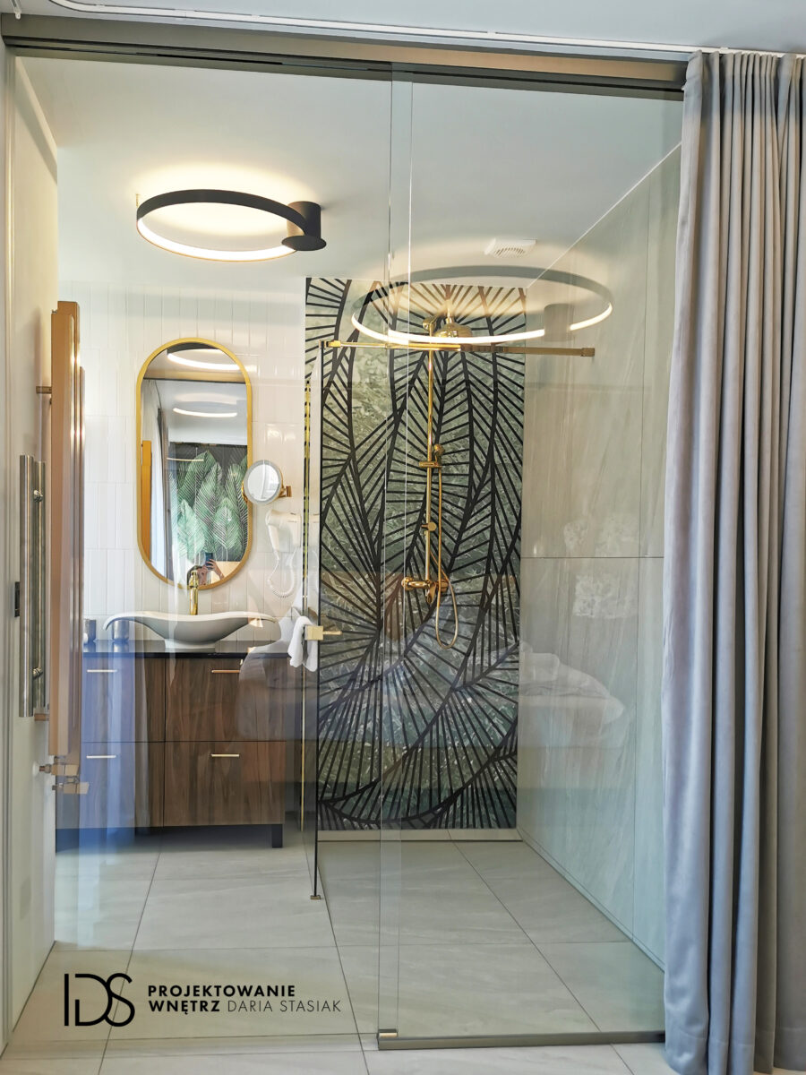 Apartament zlokalizowany nad morzem, a dokładniej w Jastrzębiej Górze w pensjonacie „Oskar”. Nieruchomość składa się z salonu kąpielowego oraz salonu z aneksem kuchennym, który został zgrabnie wkomponowany w niewielką przestrzeń. Wrażenie robi również pokój kąpielowy, który jest oddzielony przeszkleniem i dodatkowo kotarą by zachować prywatność. Ciekawym aspektem jest tapeta pod prysznicem, która nawiązuje również do tapety za wezgłowiem łóżka. Wszystko zostało zaprojektowane i wykonane na indywidualne zamówienie.