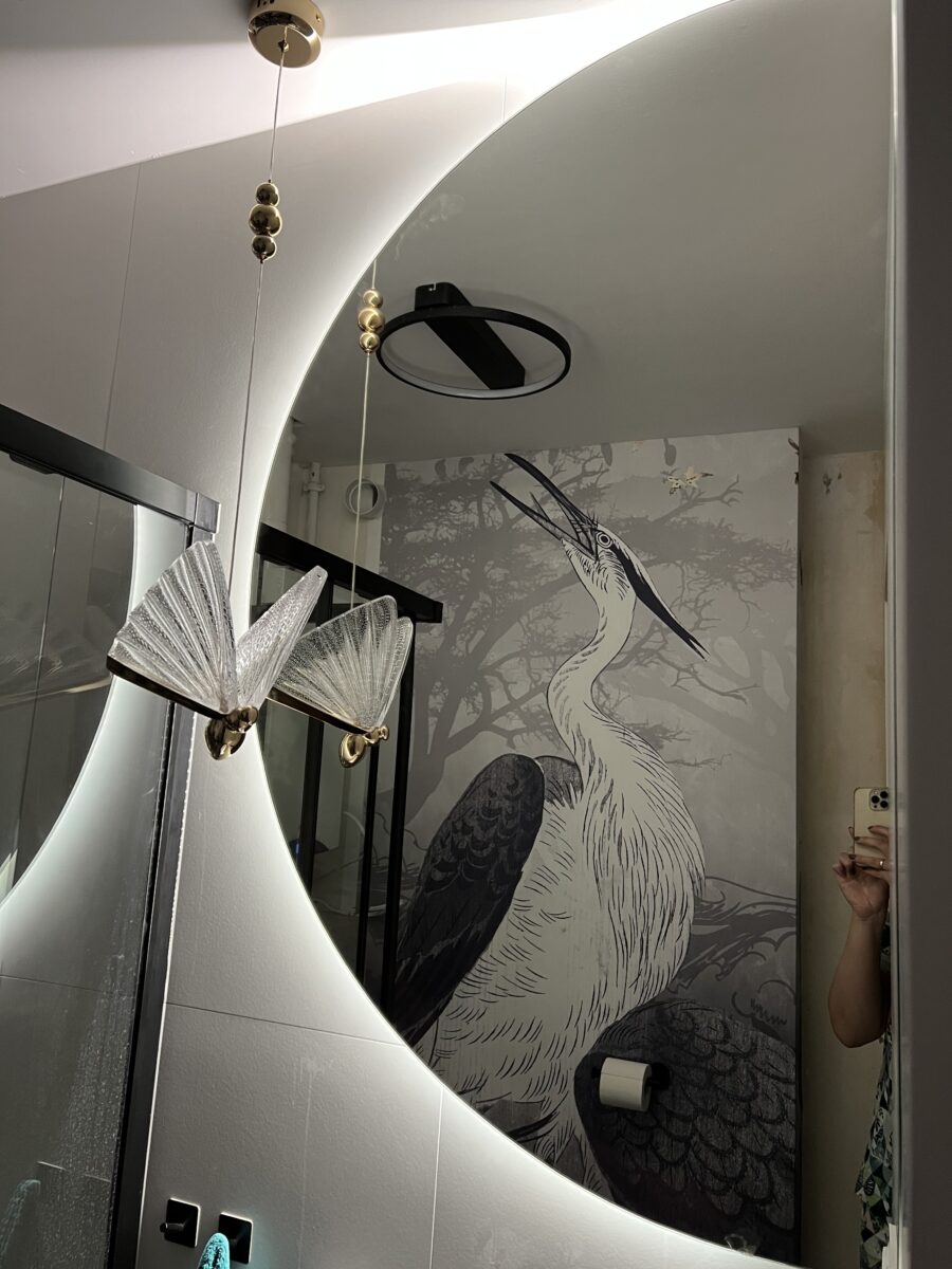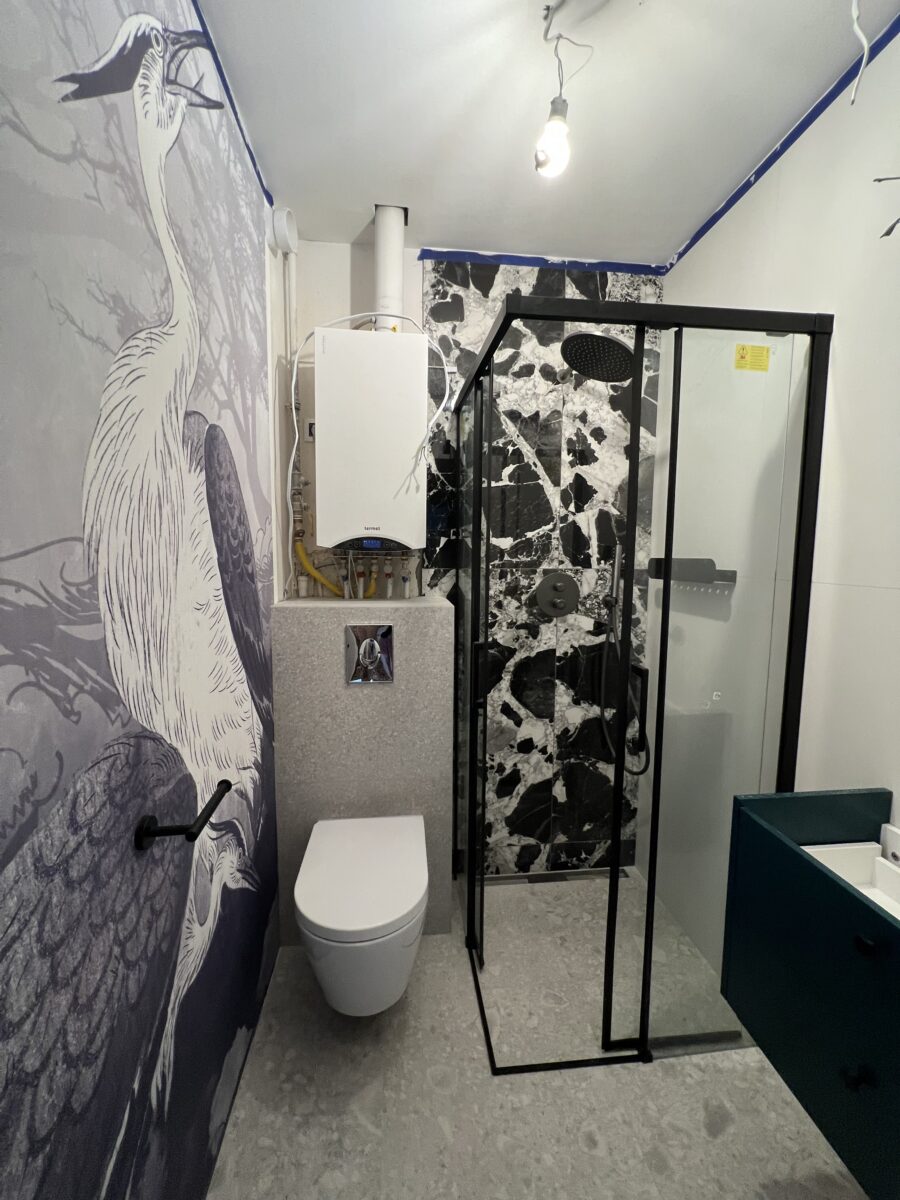 Łazienka w stanie deweloperskim o powierzchni 3,5m2 w której znajduje się wszystko, czego potrzeba w prywatnej przestrzeni przy sypialni- prysznic, wc z szafką kryjącą piec oraz szafka z umywalką. Postawiliśmy na odważne kolory, dekory oraz materiały- płytka pod prysznicem imituje kamień, na wejściu znajduje się tapeta z żurawiem oraz spalające ze sobą wszystko lastryko na podłodze. Ciekawym motywem jest lustro w nieoczywistym kształcie podświetlane od spodu wokół którego zawieszona jest lampka motyl.