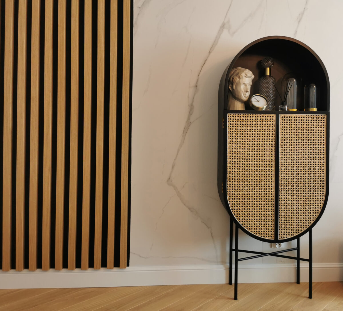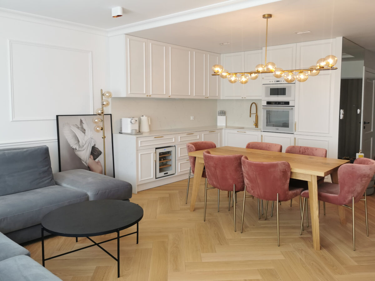 W mieszkaniu zostały użyte bardzo dobre jakościowo materiały, m.in. piękna drewniana podłoga ułożona w jodłę klasyczną, która dodaje nam ciepła i charakteru idealnie współgrając z drewnianym stołem czy fornirowane lamele ścienne.