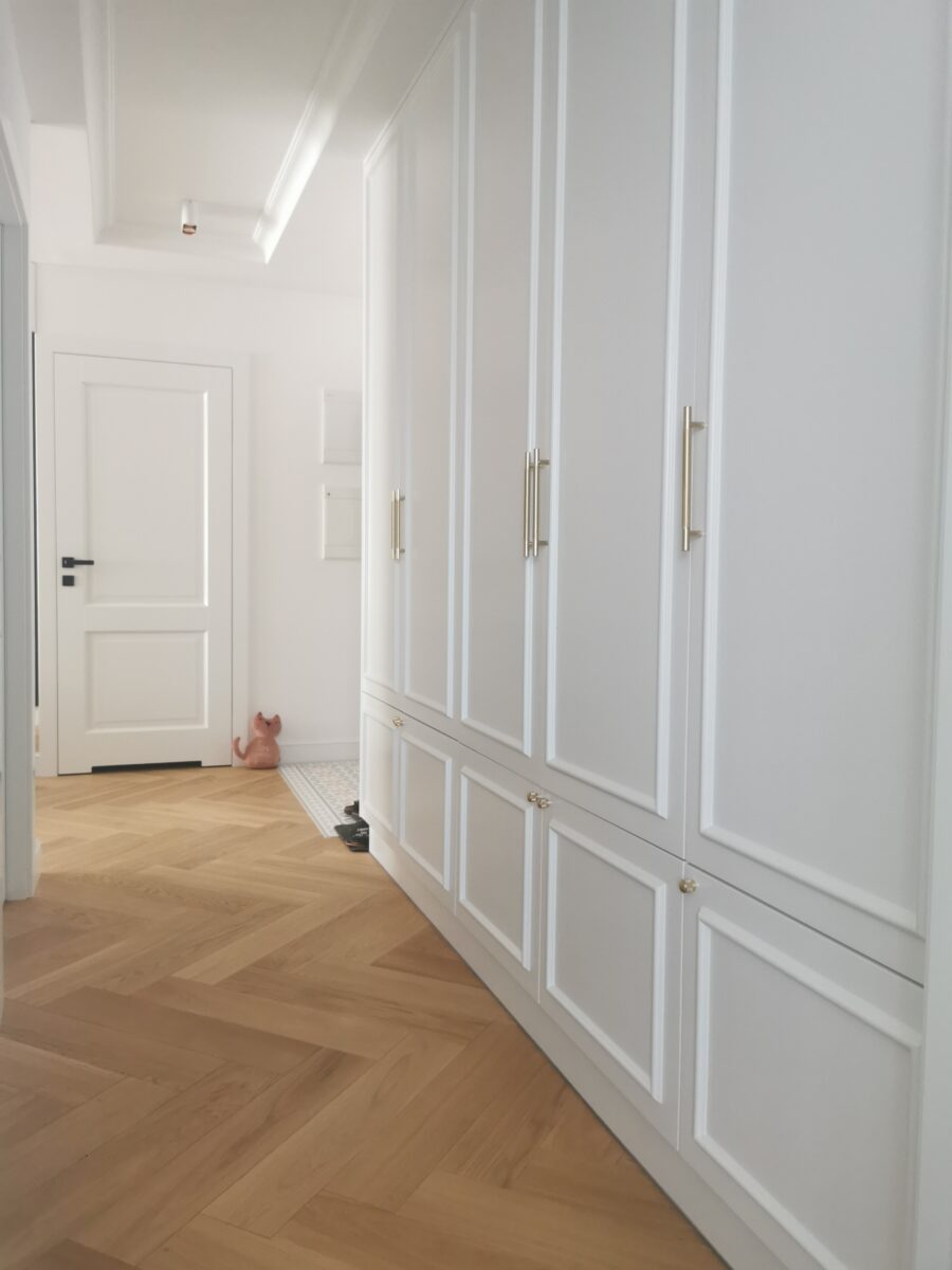 Na całej powierzchni panuje ład i harmonia jeśli chodzi o zachowaną kolorystykę i styl- dominuje sztukateria ścienna, przysufitowa oraz elementy powtarzalne możemy znaleźć na meblach wykonanych przez stolarza oraz stolarce drzwiowej.