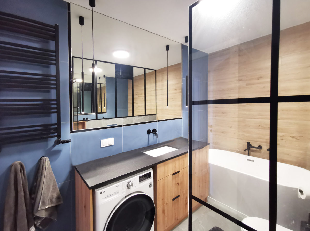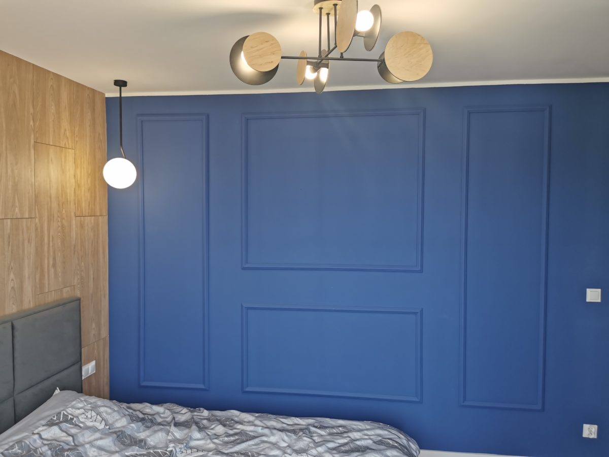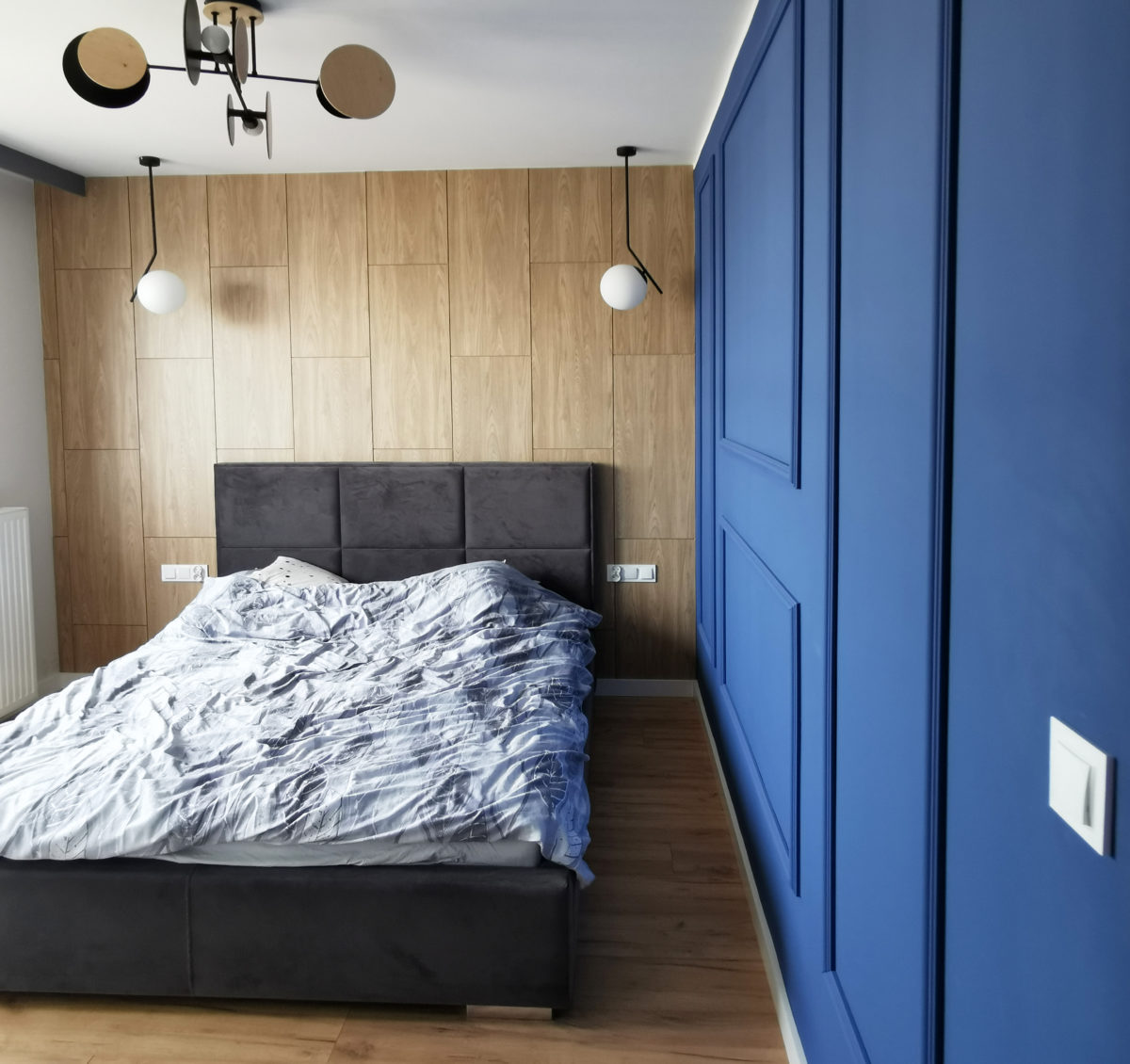 Projekt został przygotowany od podstaw i dopasowany do potrzeb Inwestora w 2019r.. Zaczęliśmy współpracę 1,5 roku przed oddaniem kluczy, dzięki czemu cały układ funkcjonalny, elektryka i hydraulika została dopasowana do Klienta, a prace wykończeniowe rozpoczęły i zakończyły się w 2020r. W męskim mieszkaniu pojawiają się elementy granatu, betonu, drewna i czerni, dzięki czemu wpasowaliśmy się w gusta Inwestora. Całość przełamuje sztukateria, która pojawia się w sypialni, korytarzu oraz na stolarce drzwiowej przełamując typowo męski charakter wnętrza.