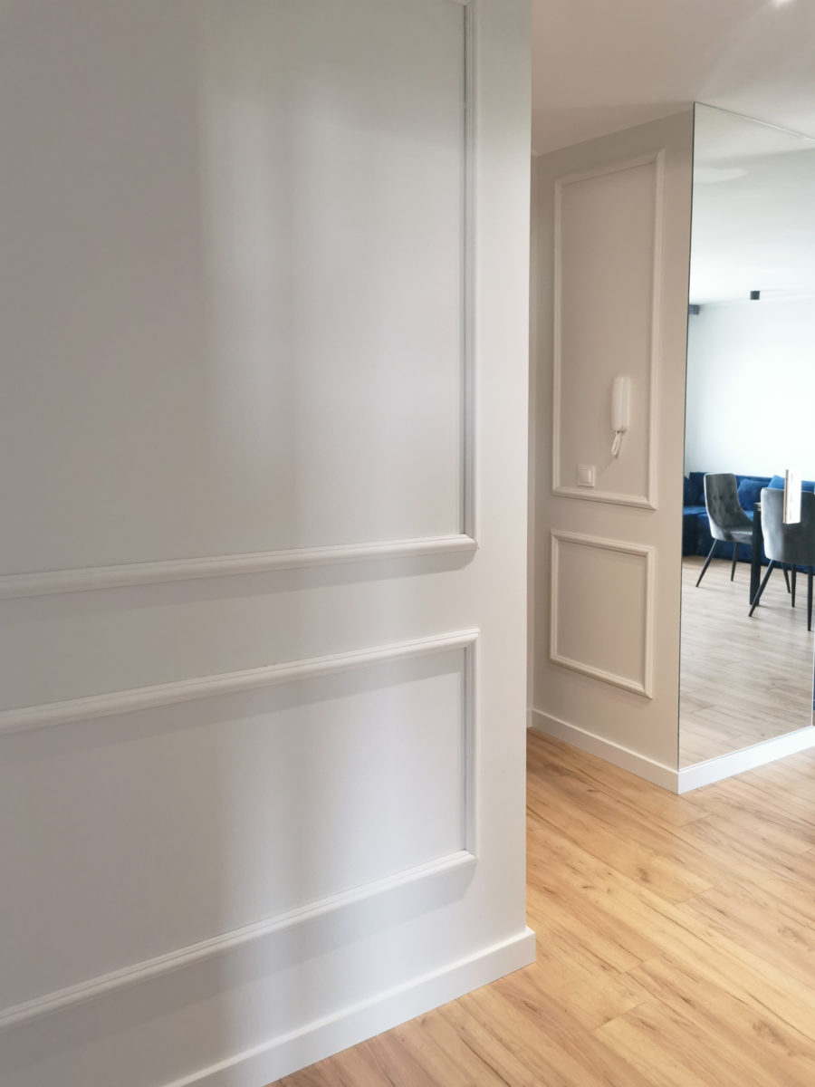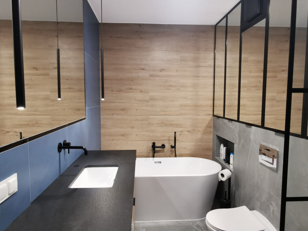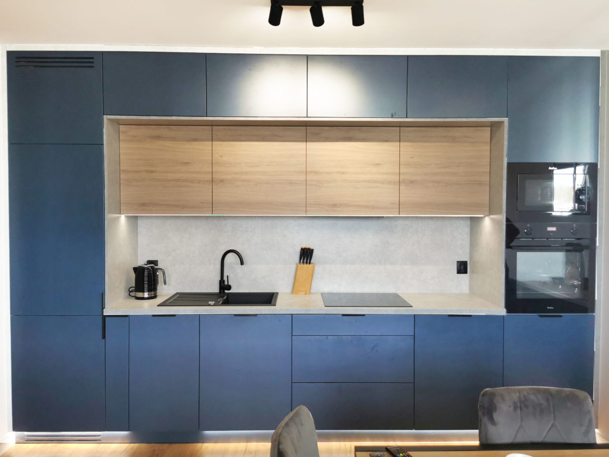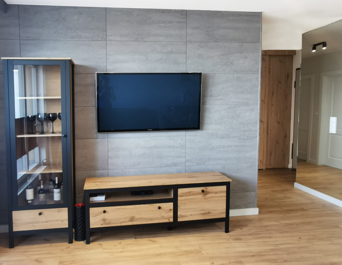 Projekt został przygotowany od podstaw i dopasowany do potrzeb Inwestora w 2019r.. Zaczęliśmy współpracę 1,5 roku przed oddaniem kluczy, dzięki czemu cały układ funkcjonalny, elektryka i hydraulika została dopasowana do Klienta, a prace wykończeniowe rozpoczęły i zakończyły się w 2020r. W męskim mieszkaniu pojawiają się elementy granatu, betonu, drewna i czerni, dzięki czemu wpasowaliśmy się w gusta Inwestora. Całość przełamuje sztukateria, która pojawia się w sypialni, korytarzu oraz na stolarce drzwiowej przełamując typowo męski charakter wnętrza.