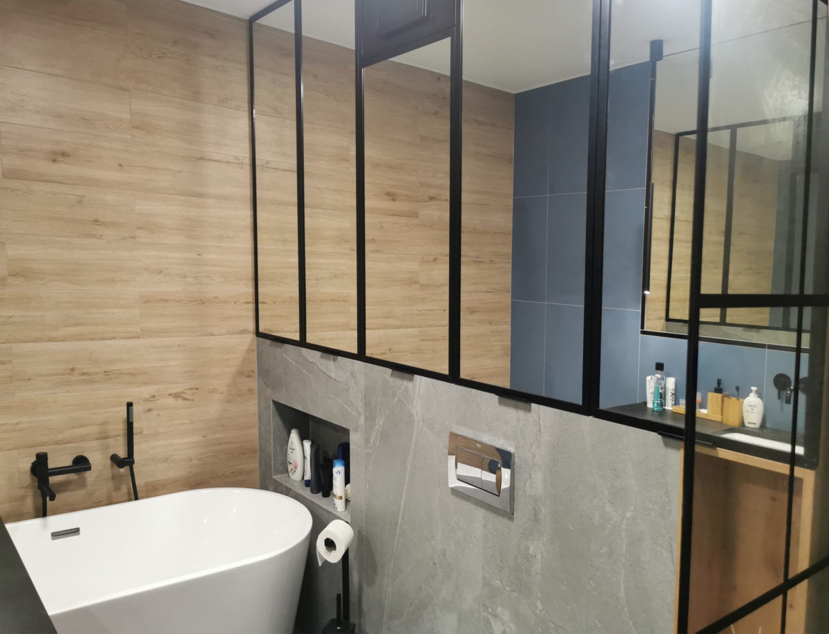 Dzięki szybko podjętej współpracy, udało nam się zaprojektować funkcjonalną łazienkę z wolnostojącą wanną oraz prysznicem plus zostało nam miejsce na całkiem pokaźną garderobę zlokalizowaną w korytarzu.
