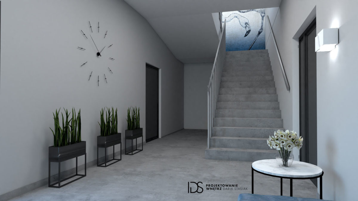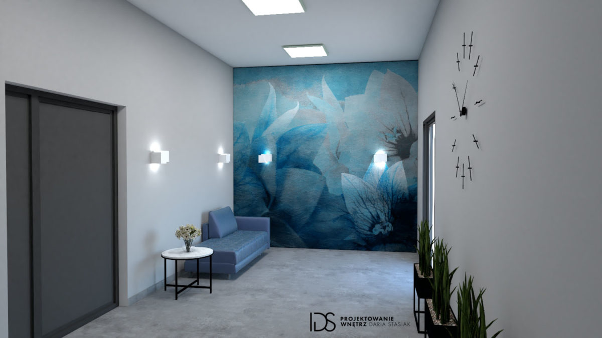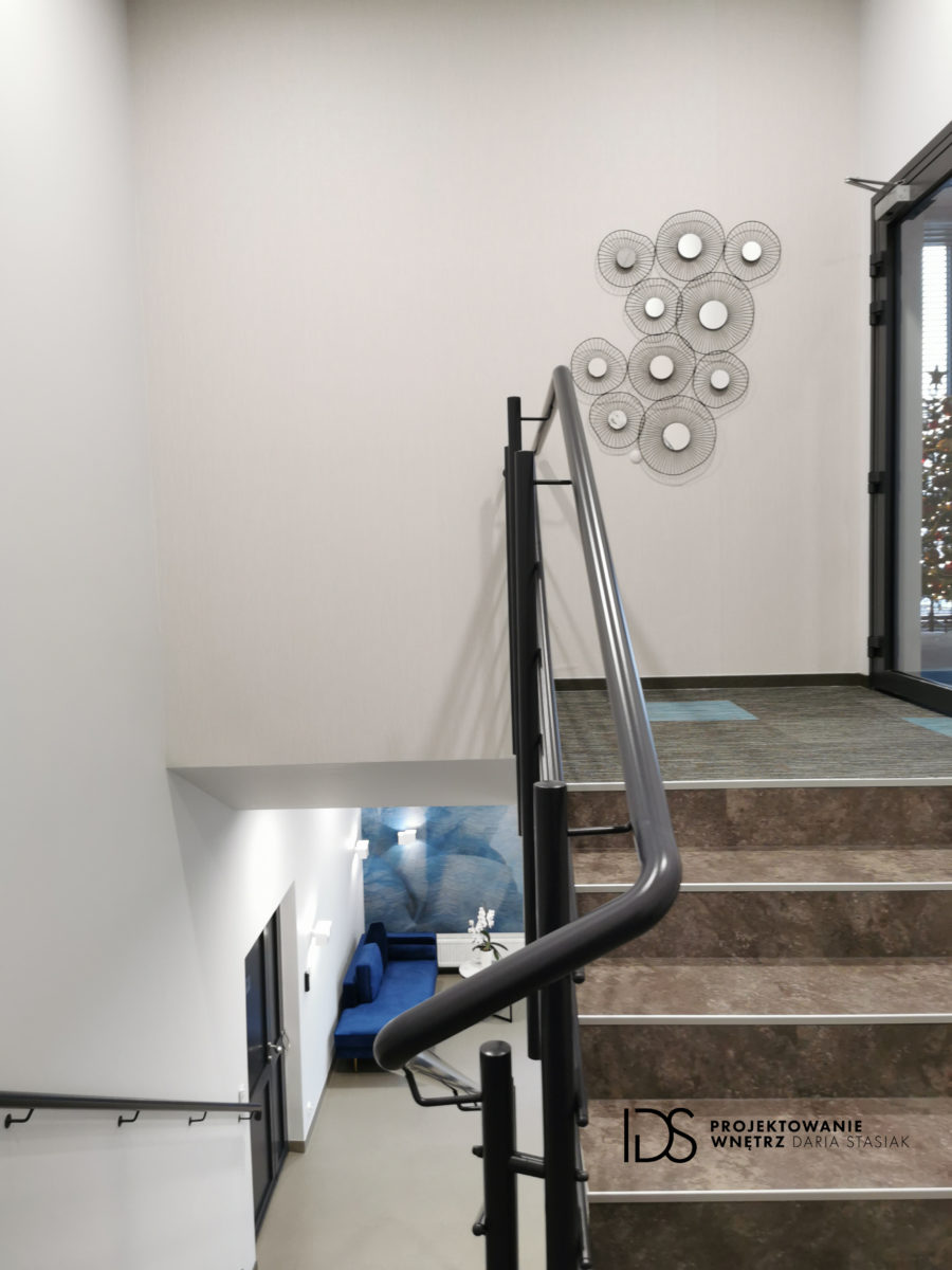 Projekt strefy komunikacji między biurami w pralni Albinos w Gdyni.