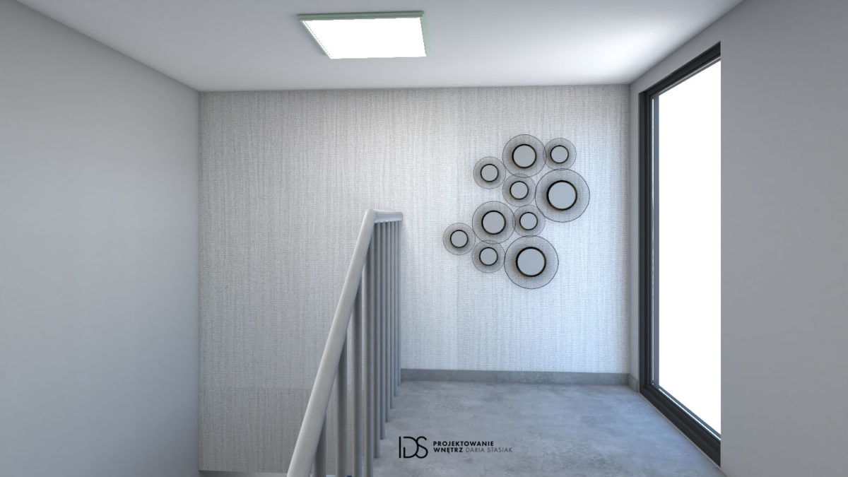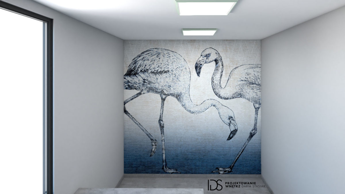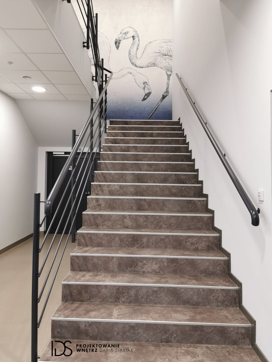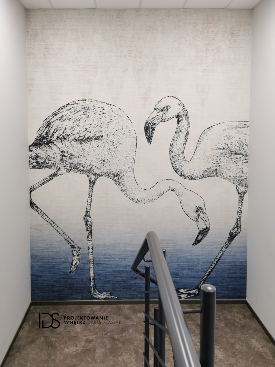Udało się nam zamienić kolor zamówionej już balustrady, która była w produkcji- Inwestorzy byli otwarci na wszelkie sugestie i doskonale odzwierciedlili projekt i zamieszczoną w nim listę zakupów w swojej realizacji. Tapety wspaniale ukazują przestrzeń (w najwyższym punkcie flamingi mają ponad 4m wysokości!) oraz dodają ciepła swoją niesamowitą strukturą i wyciszającą, królewską barwą.