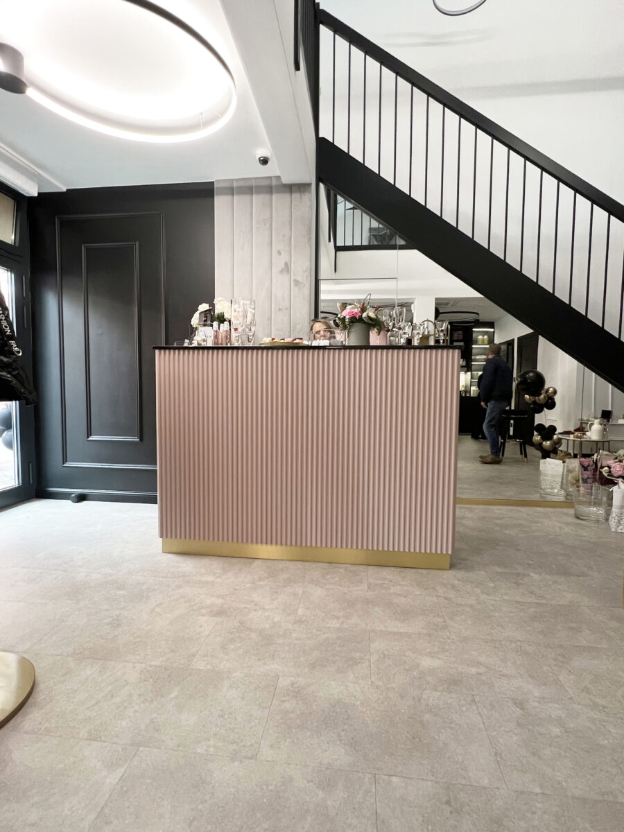 A jednak udało się! 100% mebli zostało wykonane na zamówienie- począwszy od ryflowanej lady recepcyjnej, zabudowy pod schodami, zabudowy meblowej przy strefie myjek, łazienki, socjalu, po lustra wykonane na indywidualne zamówienie wraz z metalowymi ramami.
